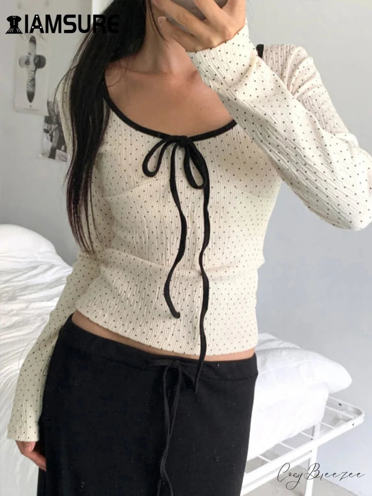 Casual Contrast Color Dot Printed Slim O-Neck Knit Top