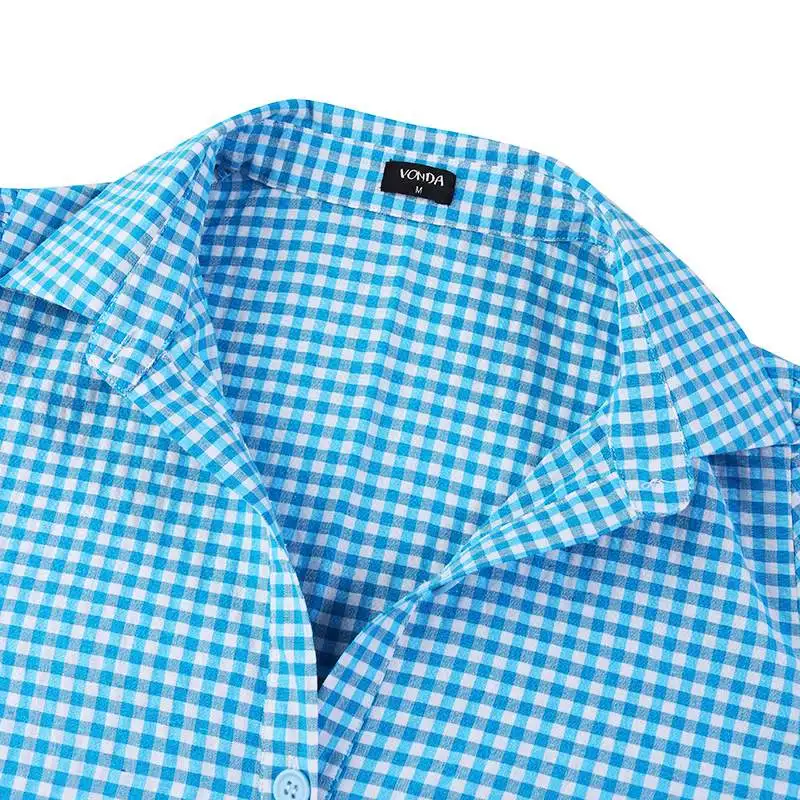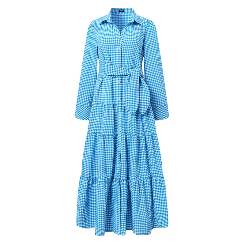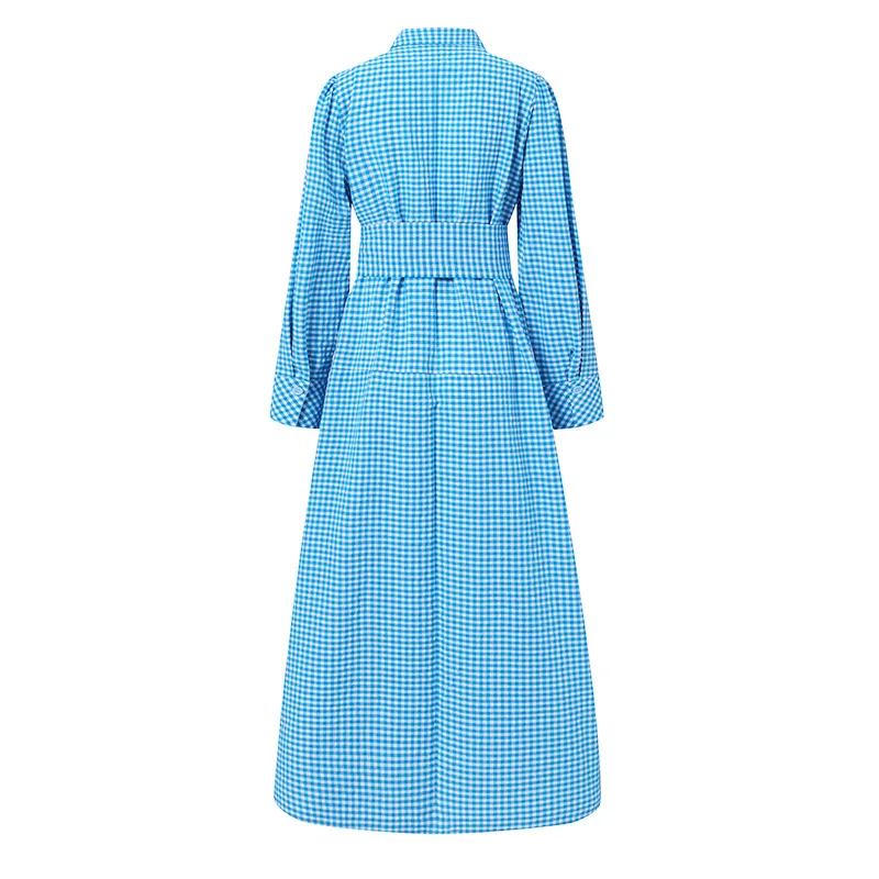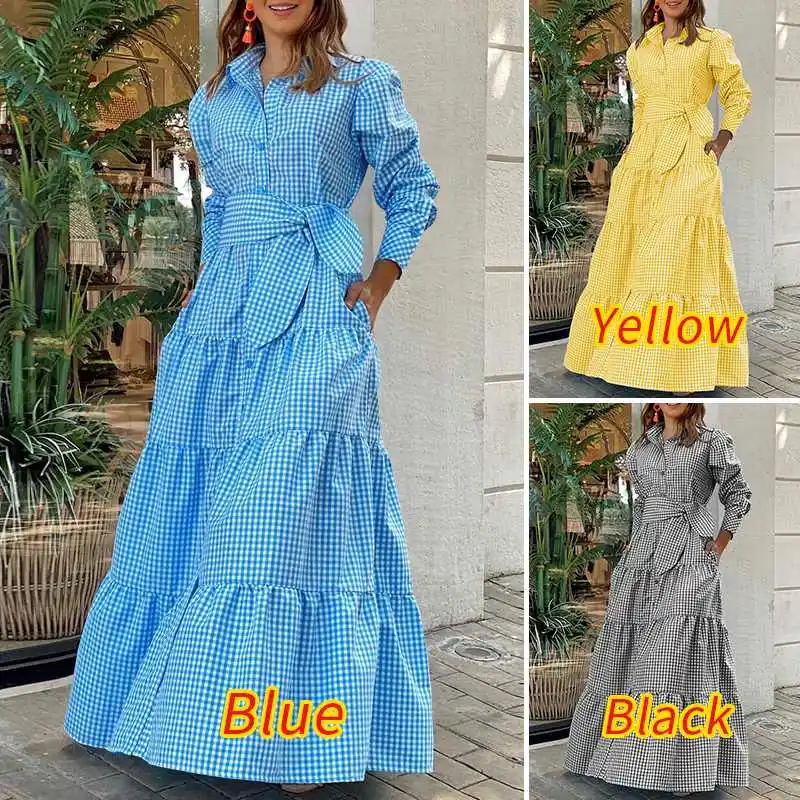Sundress Plaid Blouse Women Vintage Spring Casual Pockets Patterned Belted Lapel Party Gown Button Dresses Arm Long Robes