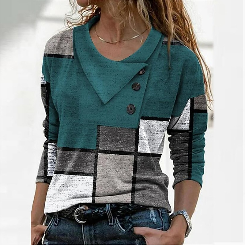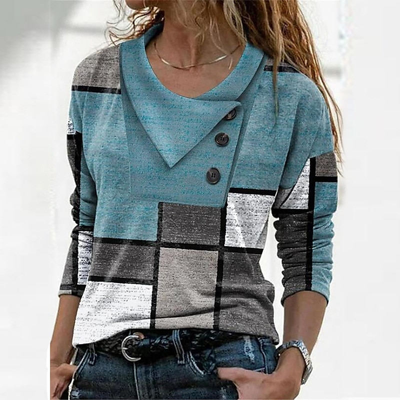 Gender:Women's,Style:Basic,Occasion:Weekend,Casual,Tops Type:T shirt Tee,Neckline:Pile Neck,V Neck,Fabric:Polyester,Design:Button,Print,Details:Without Lining,Sleeve Length:Long Sleeve,Elasticity:Micro-elastic,Look After Me:Machine wash,Wet and Dry Cleaning,Washable,Pattern:Geometric,Abstract,Theme:Painting,Geometric,