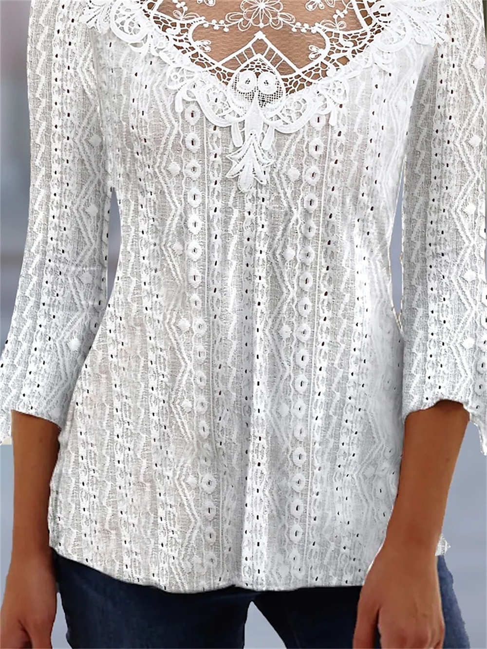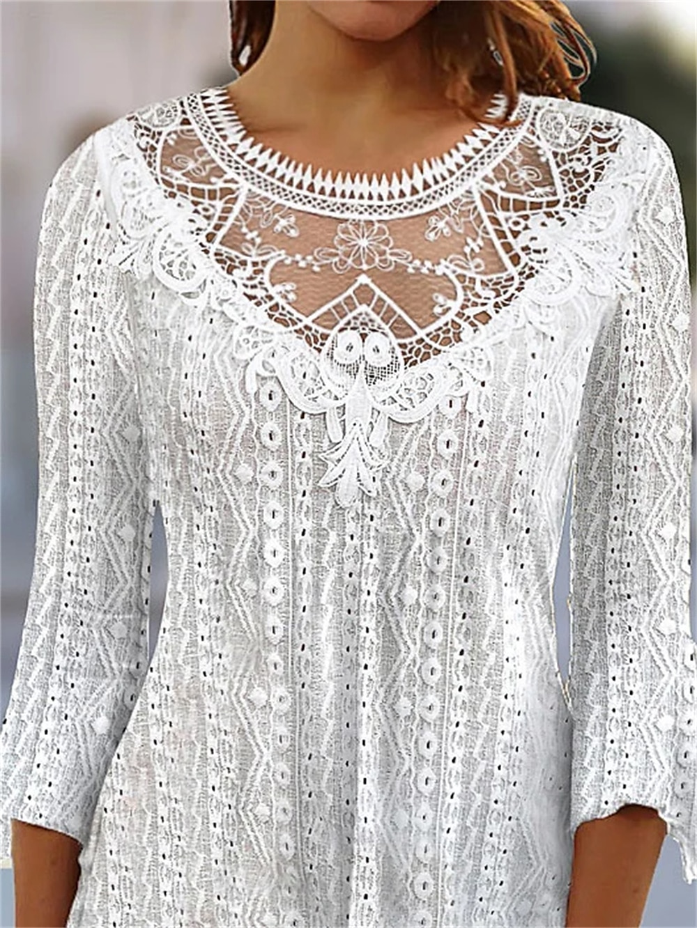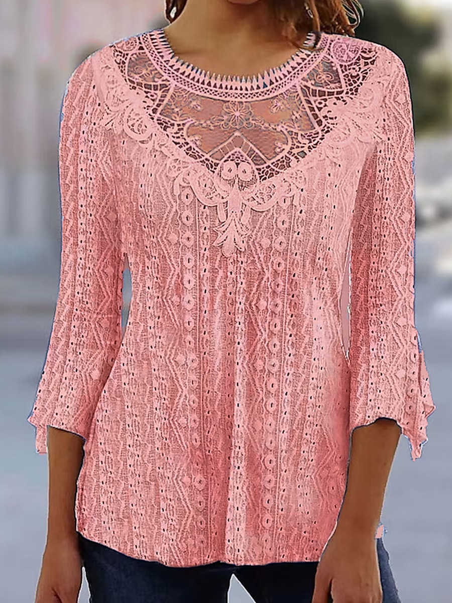 Gender:Women's,Style:Basic,Occasion:Casual,Tops Type:Shirt,Blouse,Neckline:Round Neck,Fabric:Polyester,Design:Lace,Sleeve Length:3/4 Length Sleeve,Elasticity:Micro-elastic,Look After Me:Machine wash,Wet and Dry Cleaning,Washable,Top Length:Regular,Pattern:Plain,