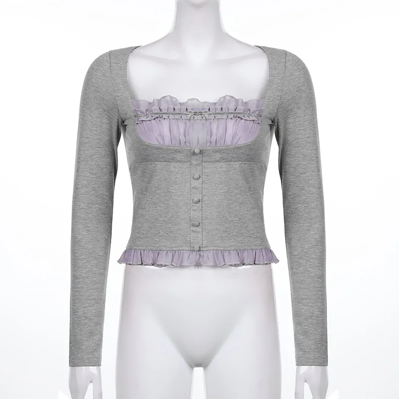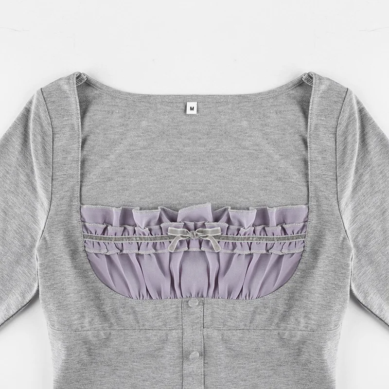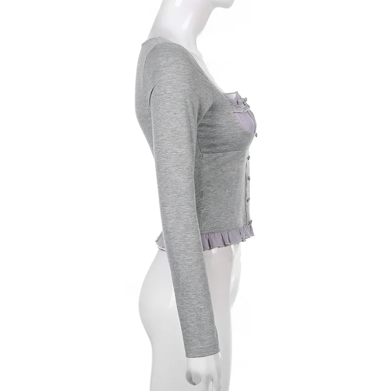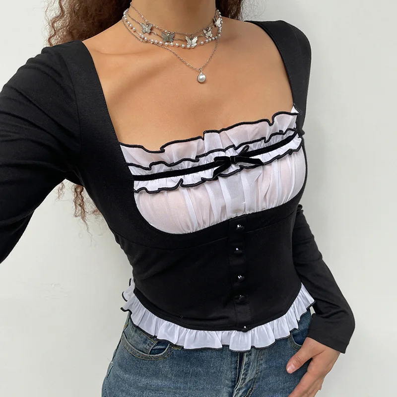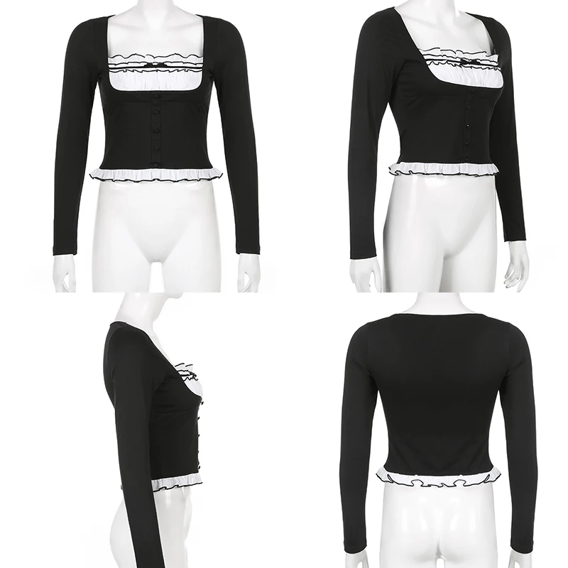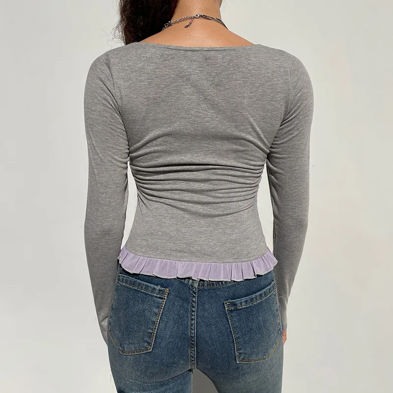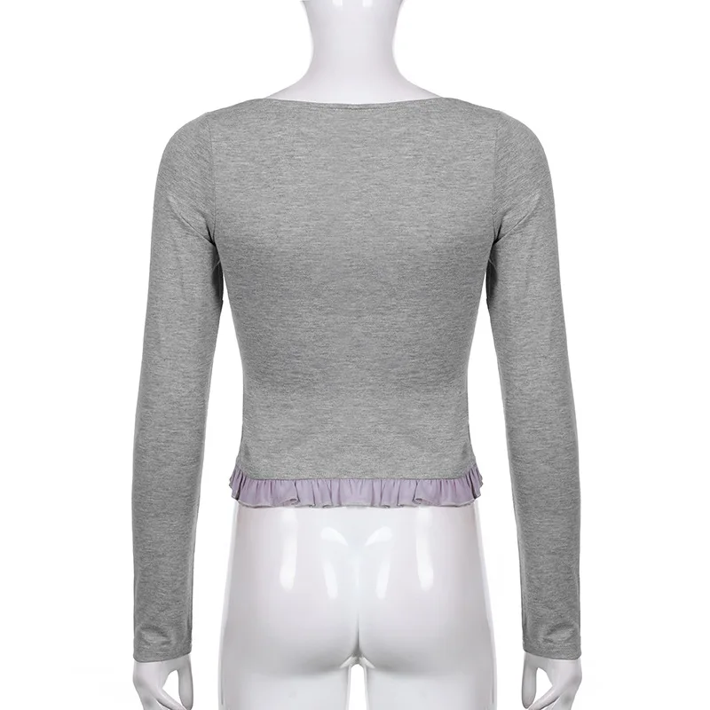 Tops Aesthetic Long Boxy Patchwork Crop Harajuku Y2K T-Shirt Vintage Women Shirts collar Arm Casual Tee Grunge