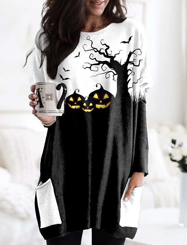 Gender:Women's,Style:Halloween,Basic,Occasion:Weekend,Halloween,Tops Type:Halloween Shirt,Tunic,T shirt Tee,Neckline:Round Neck,Fabric:Polyester,Design:Print,Pocket,Details:Without Lining,Sleeve Length:Long Sleeve,Elasticity:Micro-elastic,Look After Me:Wet and Dry Cleaning,Washable,Machine wash,Pattern:Pumpkin,Graphic,Season:Fall & Winter,Theme:Painting,Abstract,Floral,