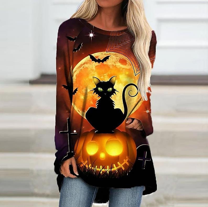 Gender:Women's,Style:Halloween,Vintage,Occasion:Halloween,Casual,Tops Type:Halloween Shirt,Tunic,T shirt Tee,Neckline:Round Neck,Fabric:Polyester,Design:Print,Patchwork,Sleeve Length:Long Sleeve,Elasticity:Micro-elastic,Look After Me:Machine wash,Size Suggestion:standard size, select your usual size,Pattern:Pumpkin,Cat,Season:Fall & Winter,Theme:Cat,Special Size:Plus Size,