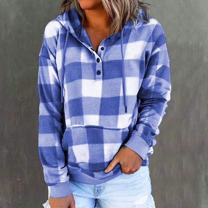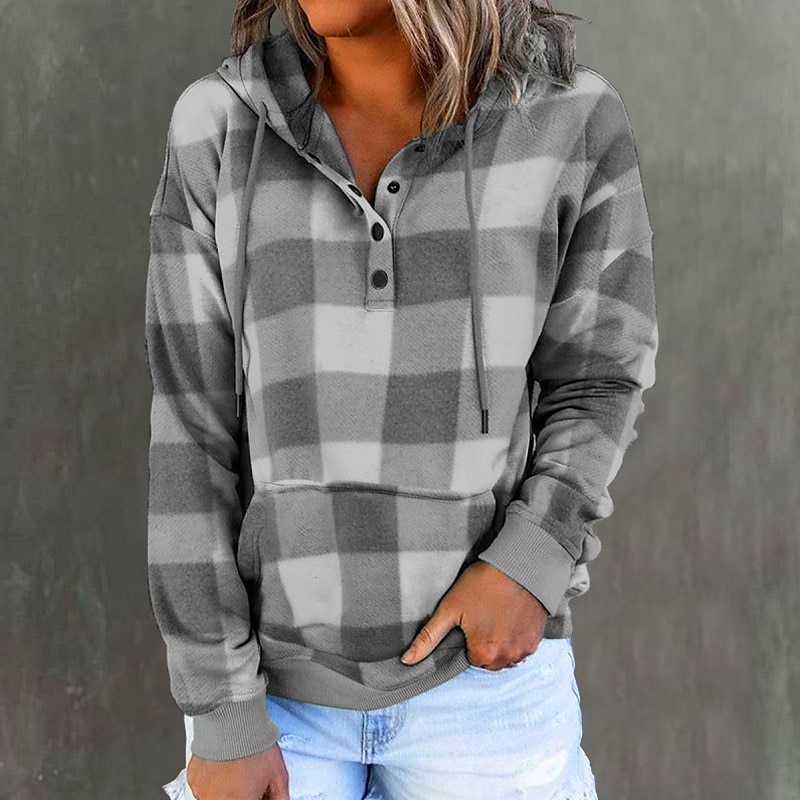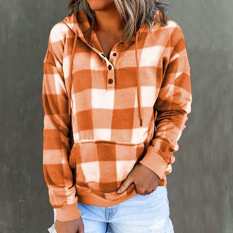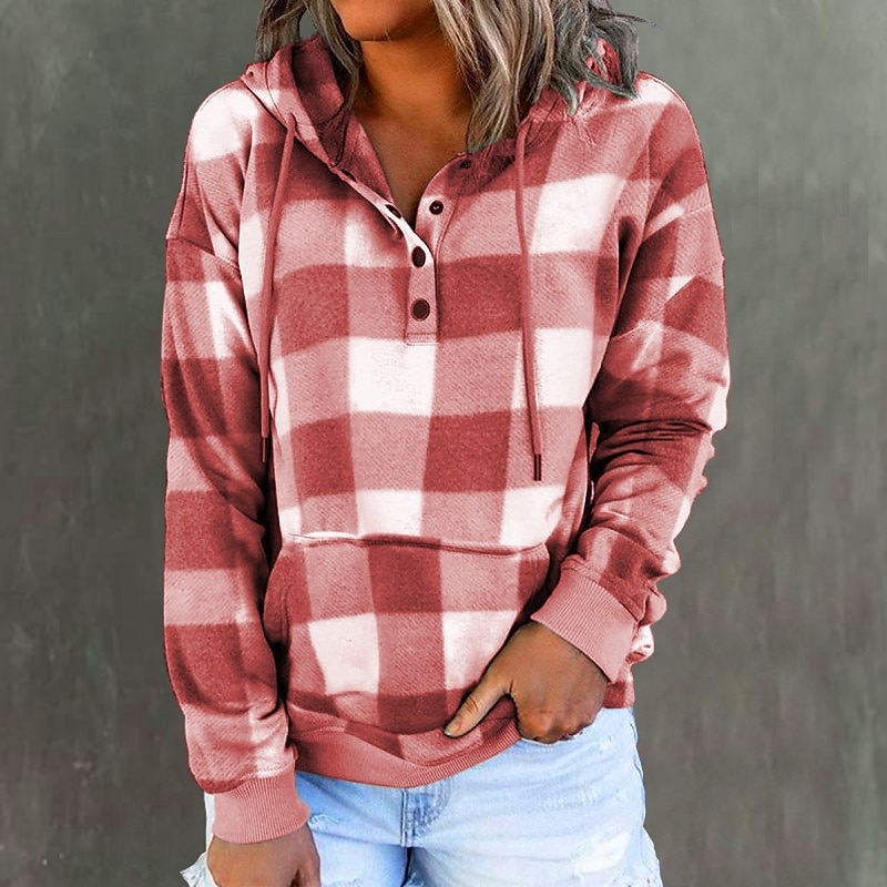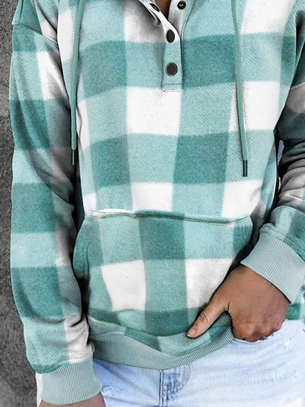 Gender:Women's,Style:Fashion,Occasion:Sports,Casual,Sports Clothing Sub Category:Pullover,Hoodie Sweatshirt,Neckline:Hoodie,Fabric:Polyester,Design:Front Pocket,Drawstring,Button,Sleeve Length:Long Sleeve,Elasticity:Micro-elastic,Look After Me:Washable,Wet and Dry,Machine wash,Top Length:Regular,Pattern:Plaid,Season:Fall & Winter,Details:Top,Fit Type:Regular Fit,