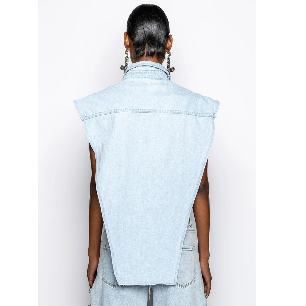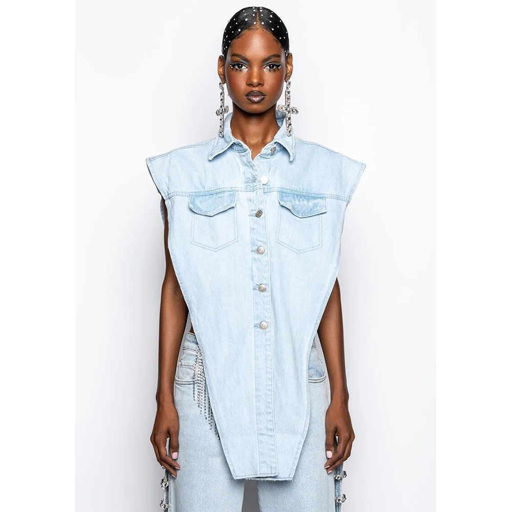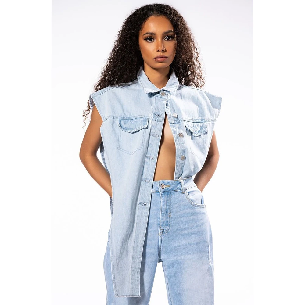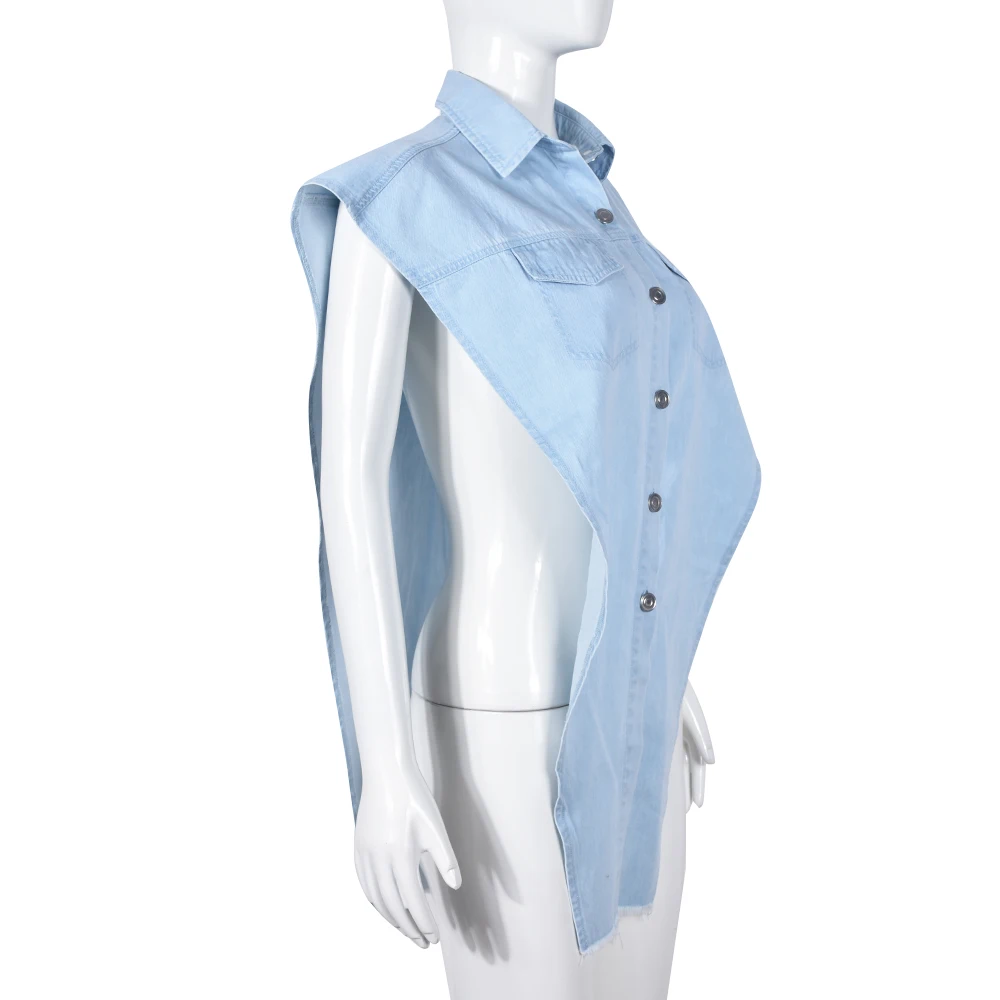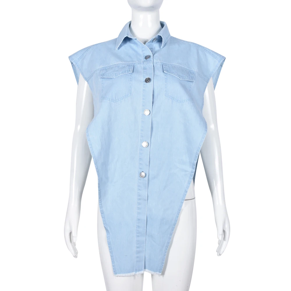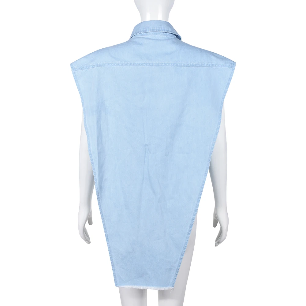 and Irregular with Out Denim Vest Hollow Shoulder Length Detail Hem