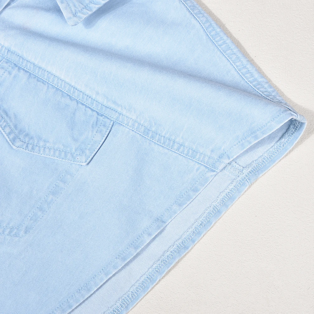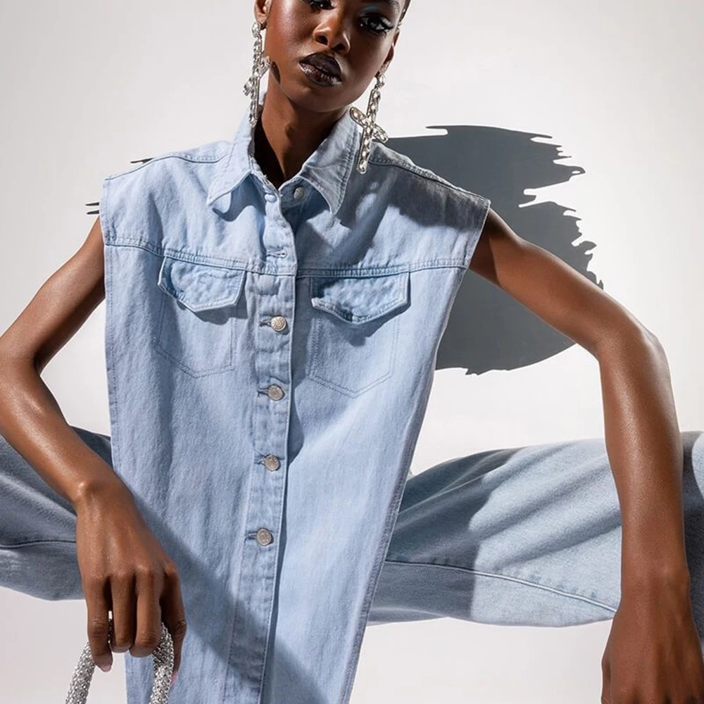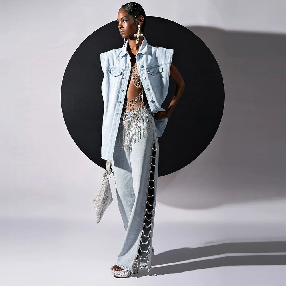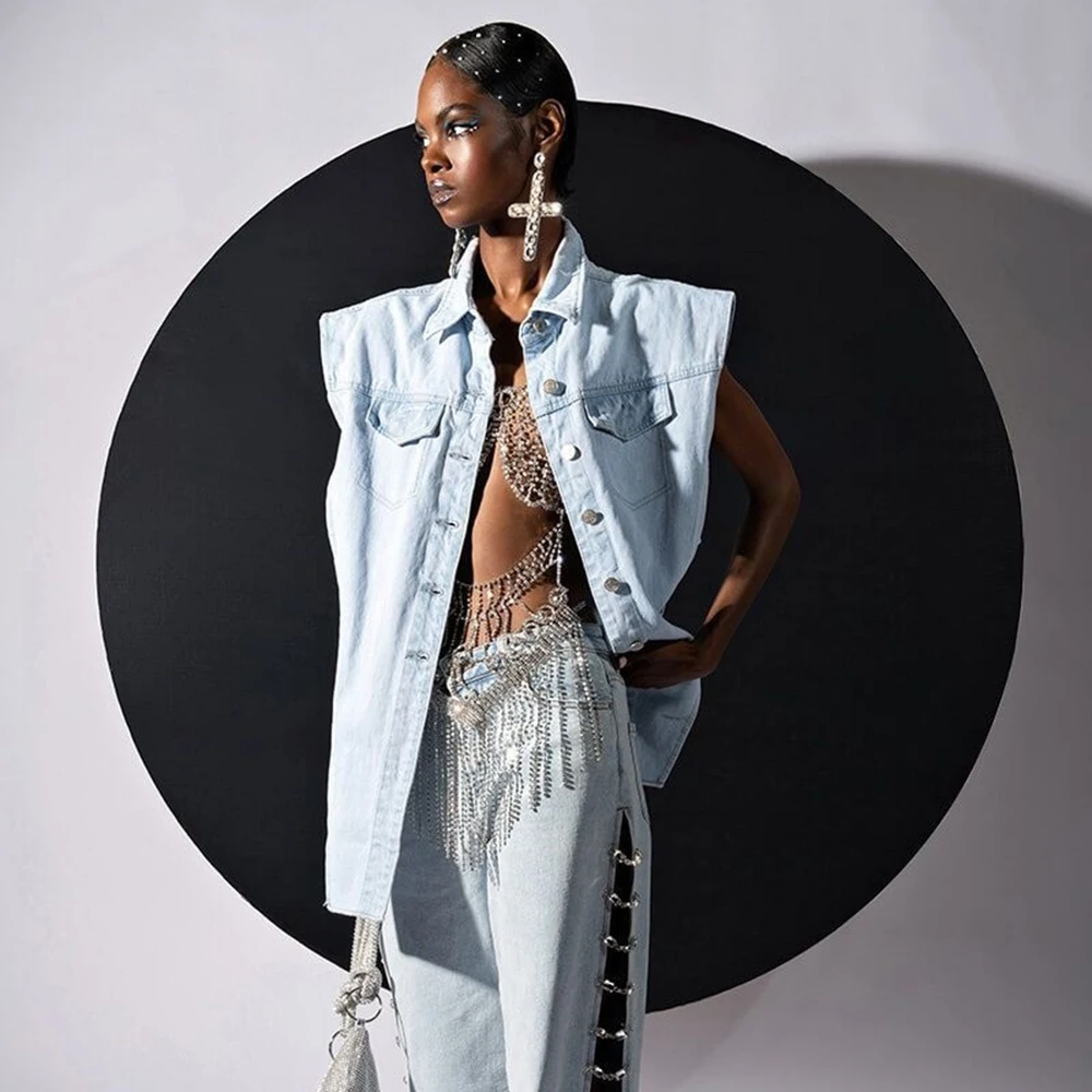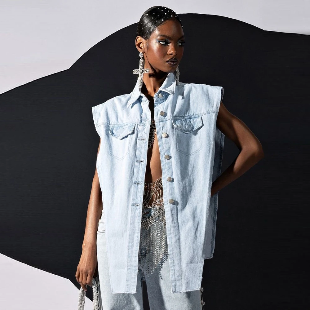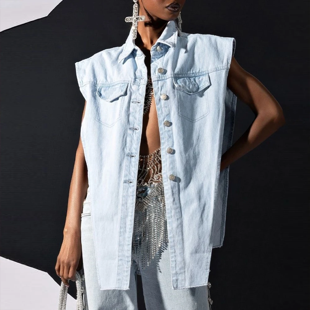 and Irregular with Out Denim Vest Hollow Shoulder Length Detail Hem