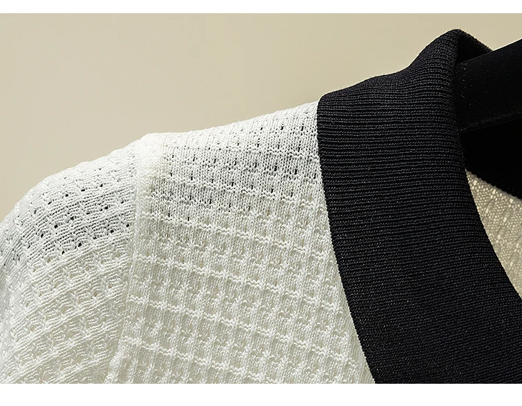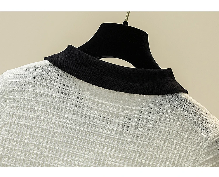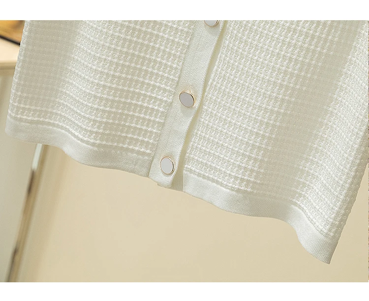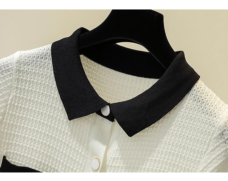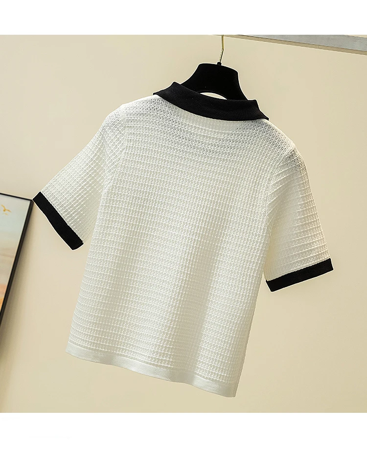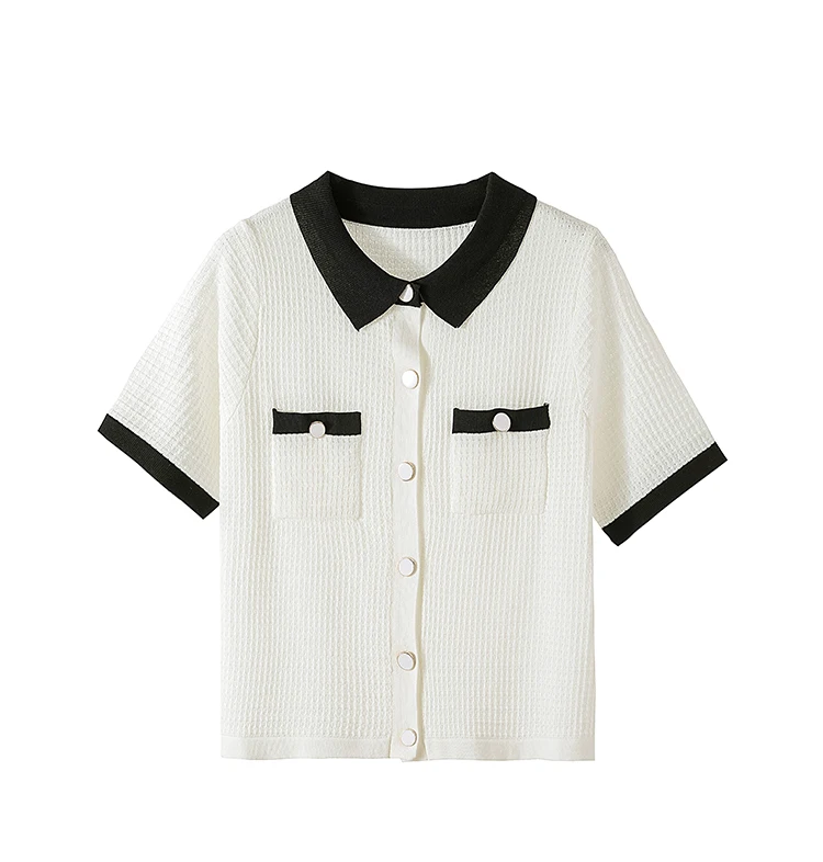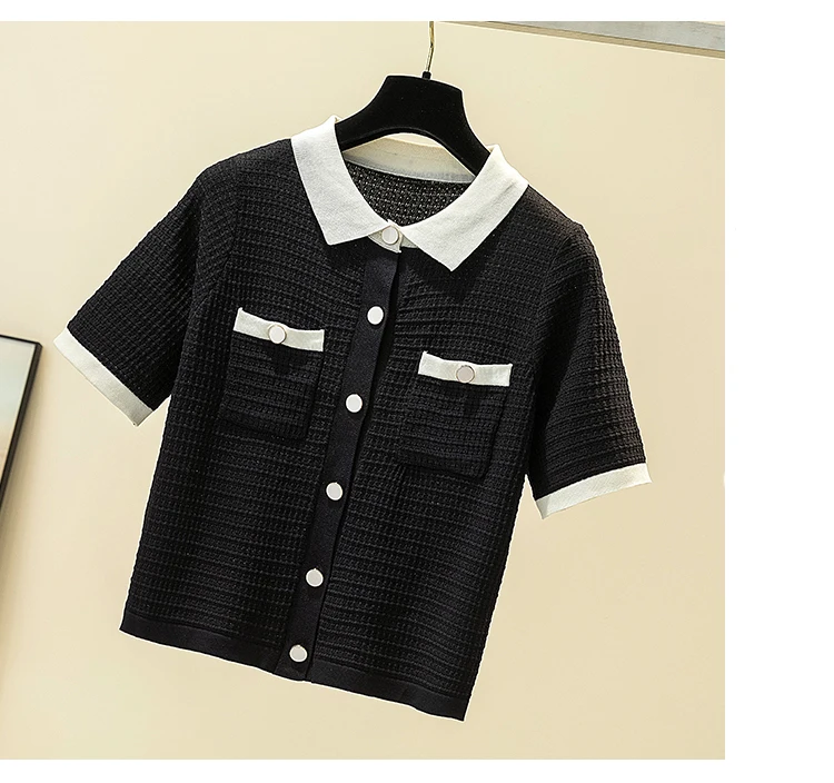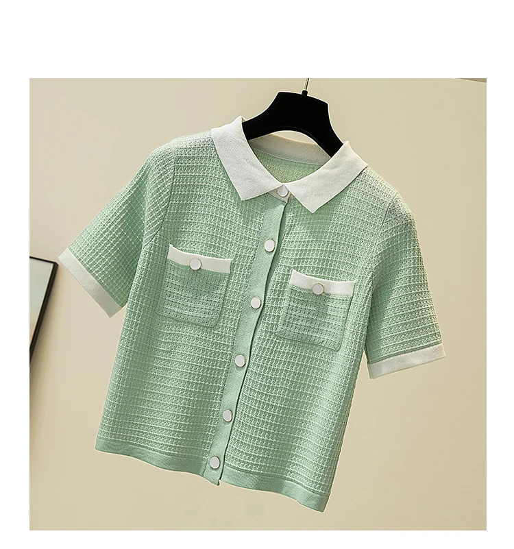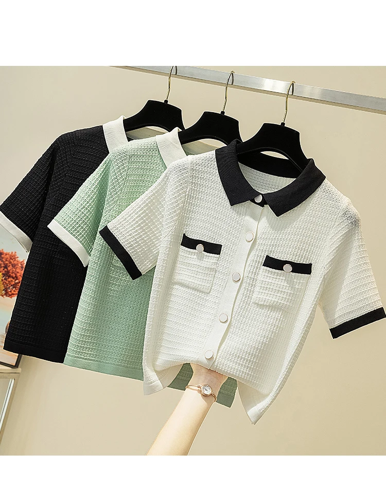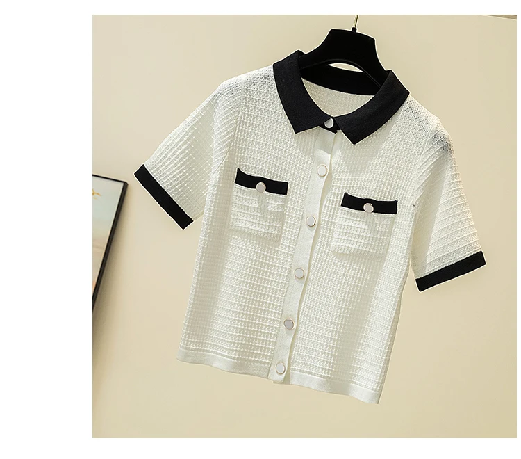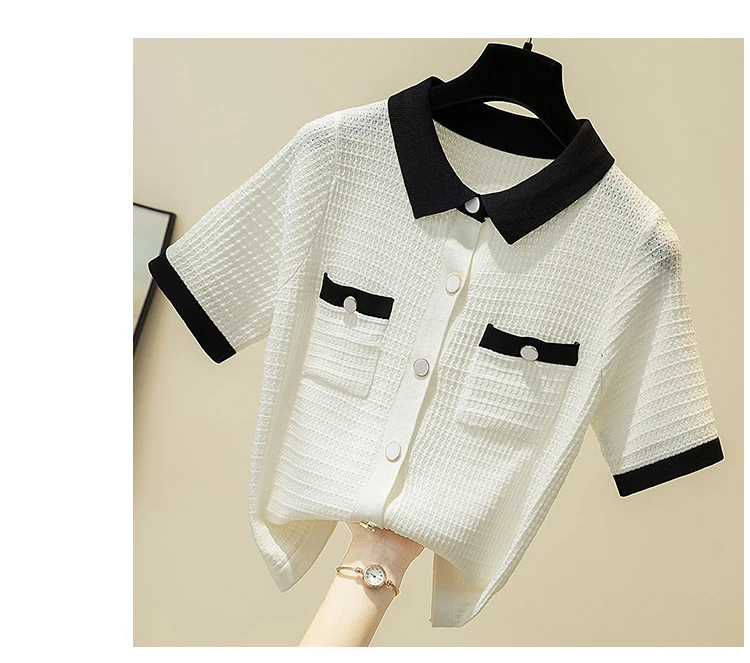 Thin Knitted T Shirt Women Button Cardigan Womens Tops Korean Clothes Summer Short Sleeve Turn-Down Collar Tee Shirt Femme