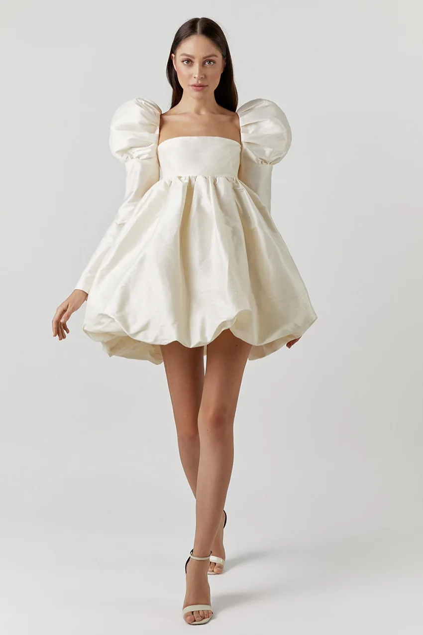 PrincessAce New Fashion Puff Sleeves Woman Party Dress Evening Chic Square Collar Ball Gown Dress Short Beige Satin Dresses Pleated Ladies