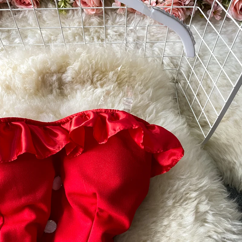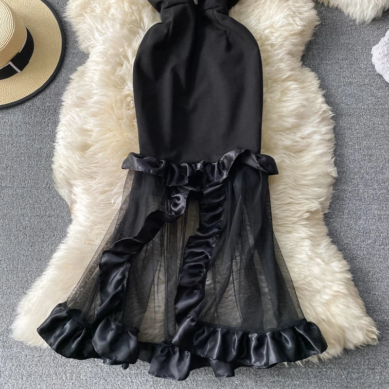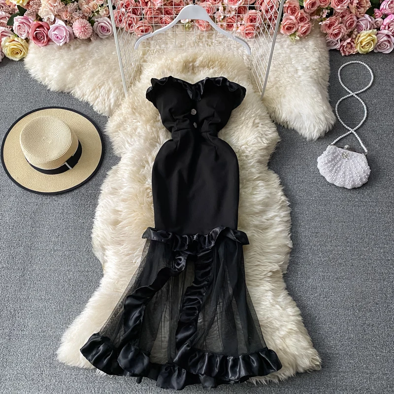 Women Sexy Female Dresses Patchwork Bodycon Strapless Gown Red Mesh Party Dinner Slim Strap Warm-Season Long Spaghetti Dress