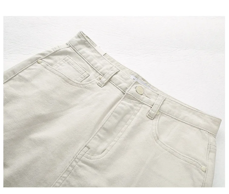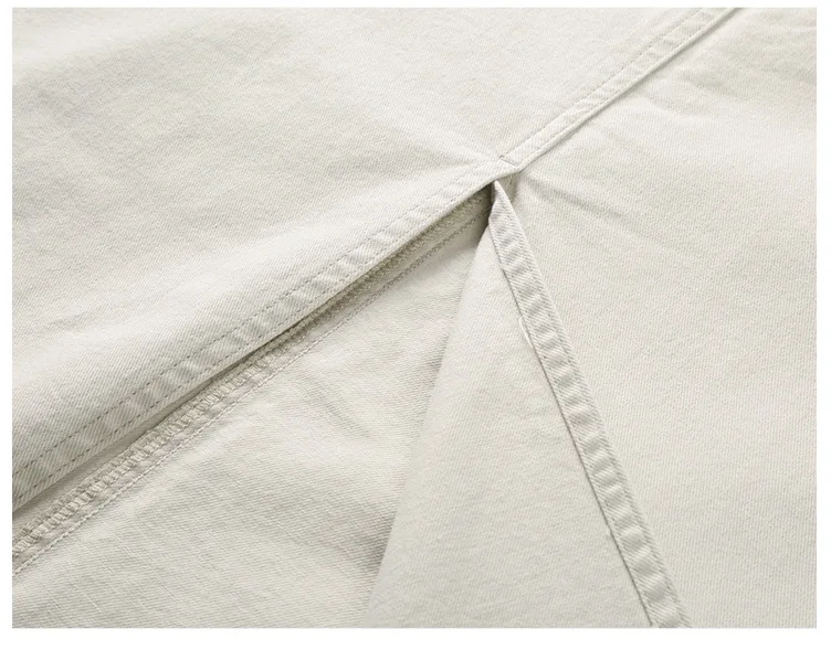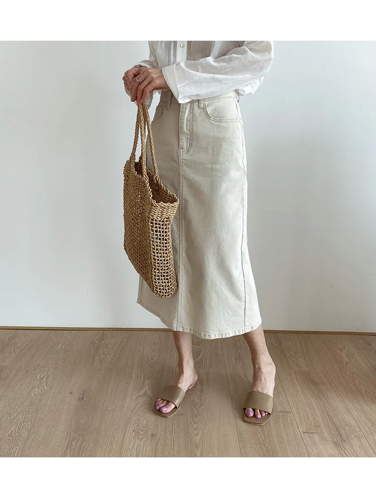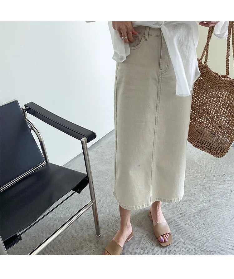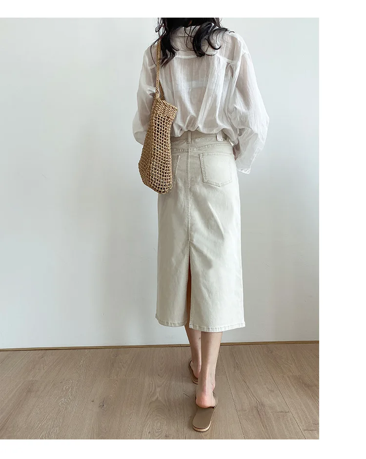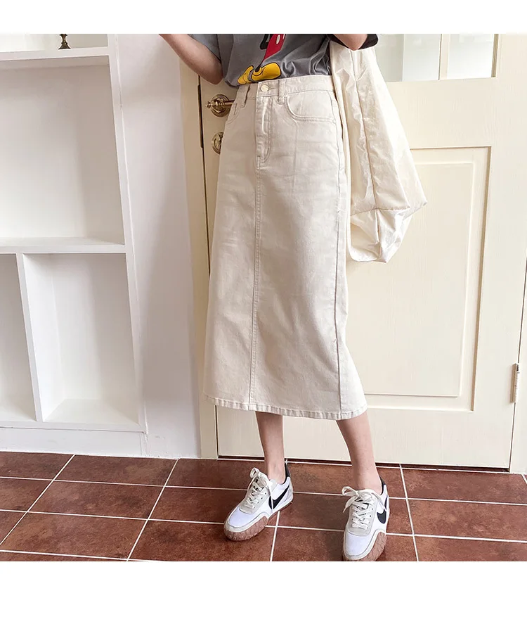 Vintage High Solid Waist Midi Split Denim Warm-Season Women Skirt Elegant White
