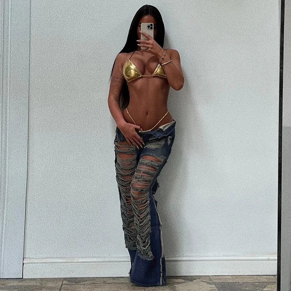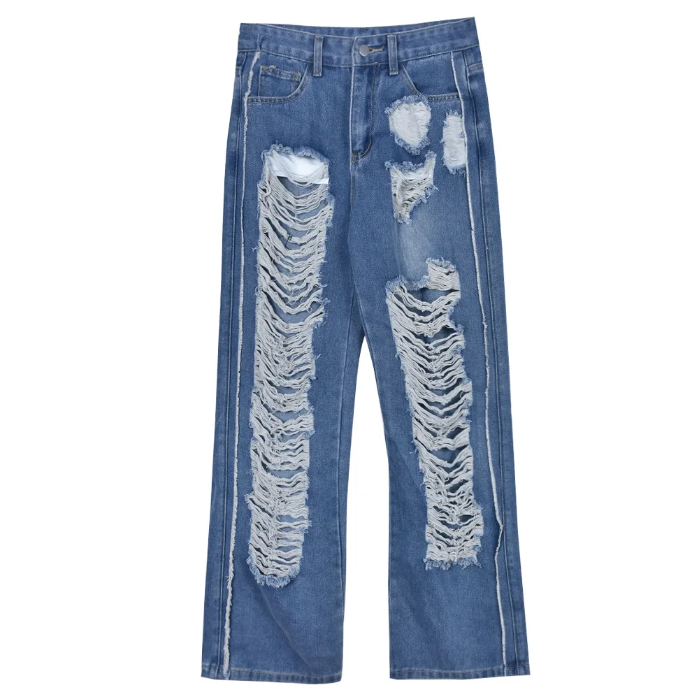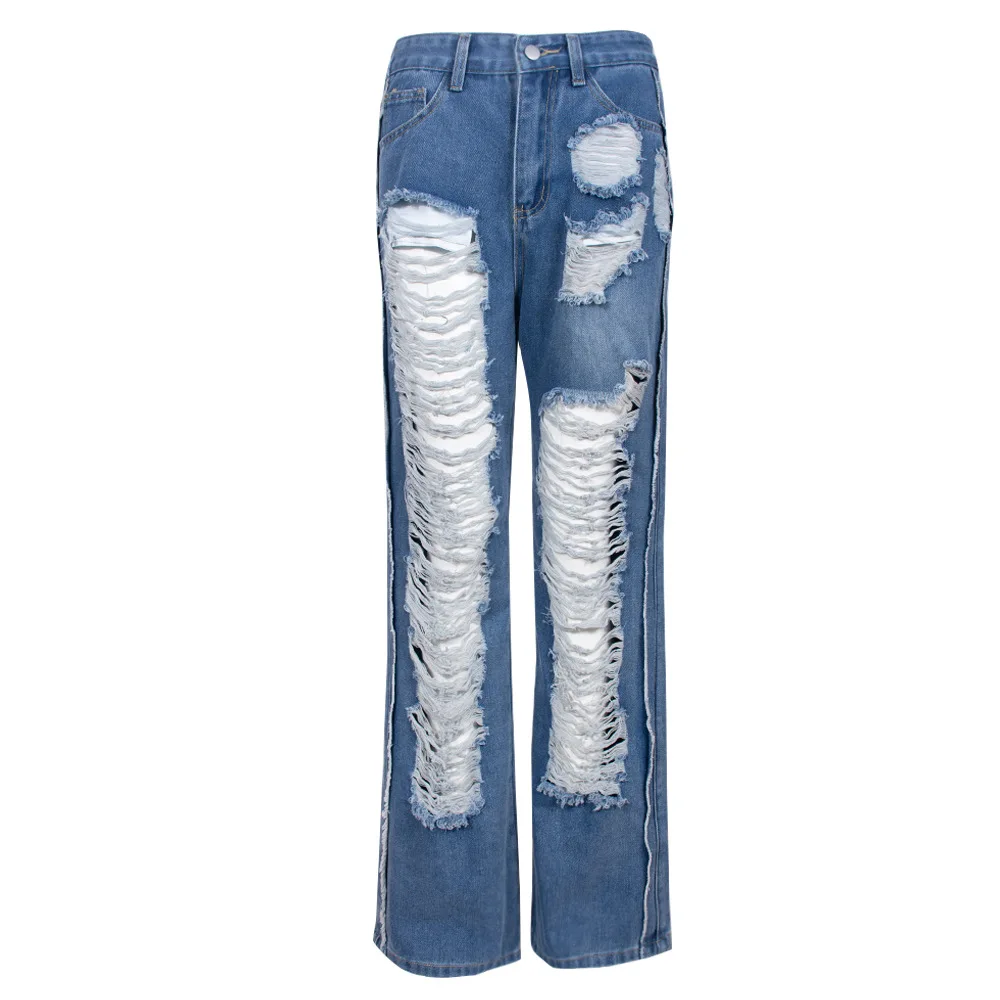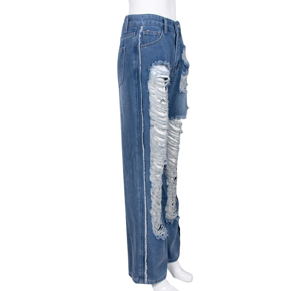 Women Fashion Ripped Hollow Out Wide Leg Full Length Jeans 2023 New Summer INS Street Denim Pants Trousers
