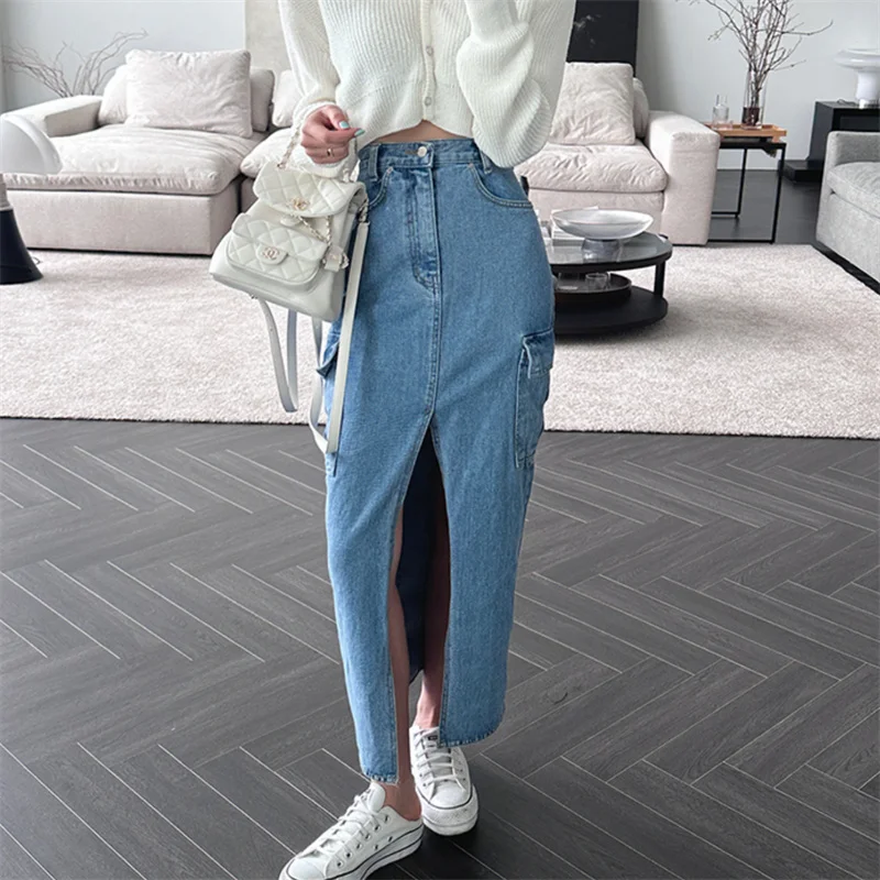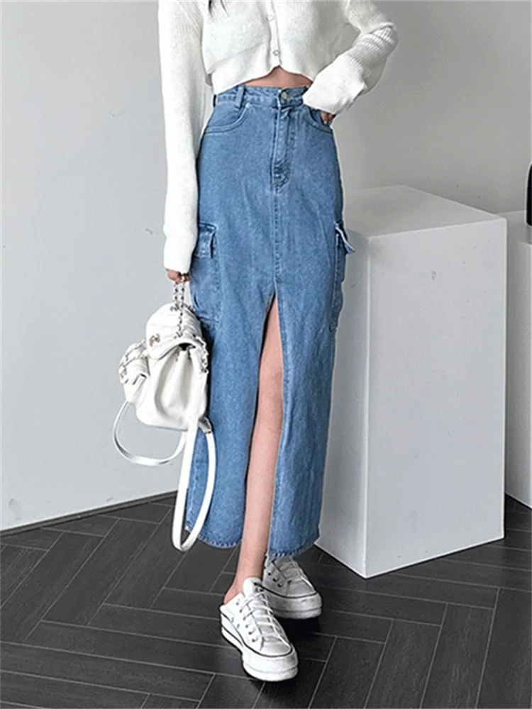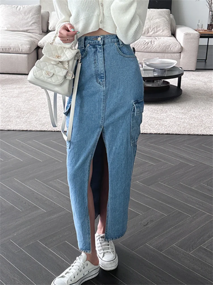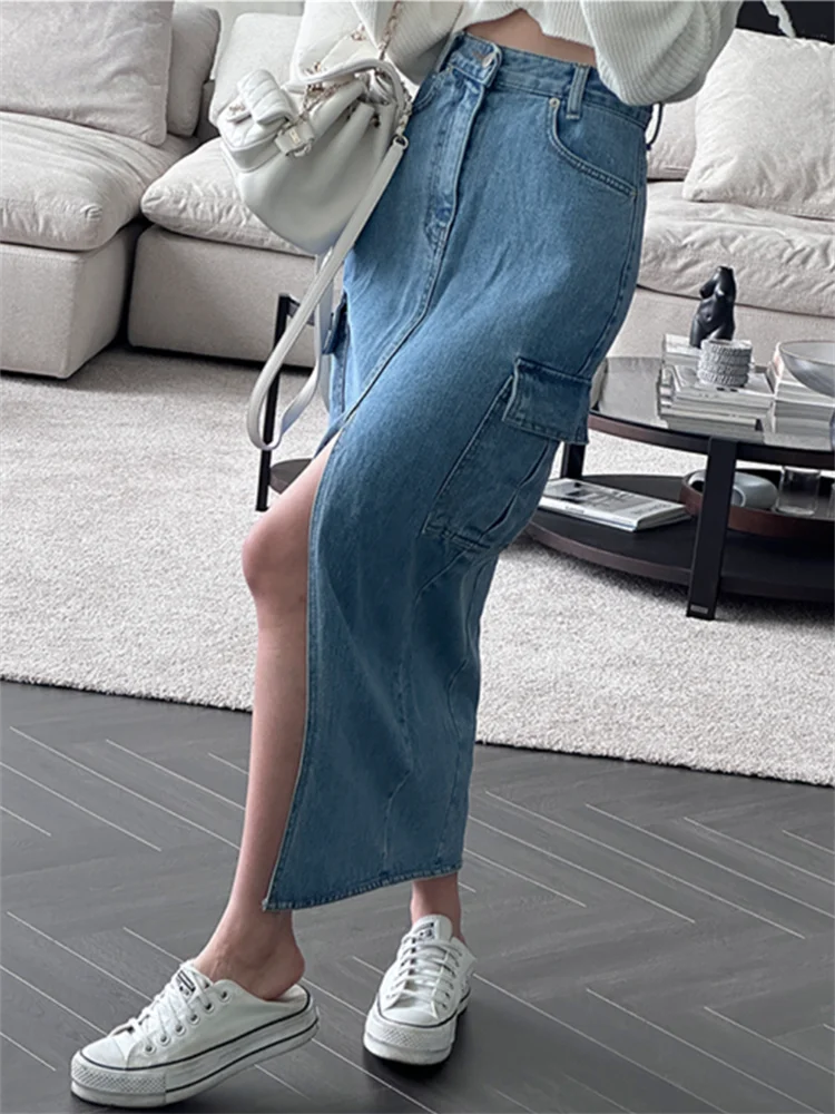 Waisted Jeans Fashion Split Side Streetwear High Skirt Pockets Y2k Women's Vintage Casual Cargo Midi Skirt