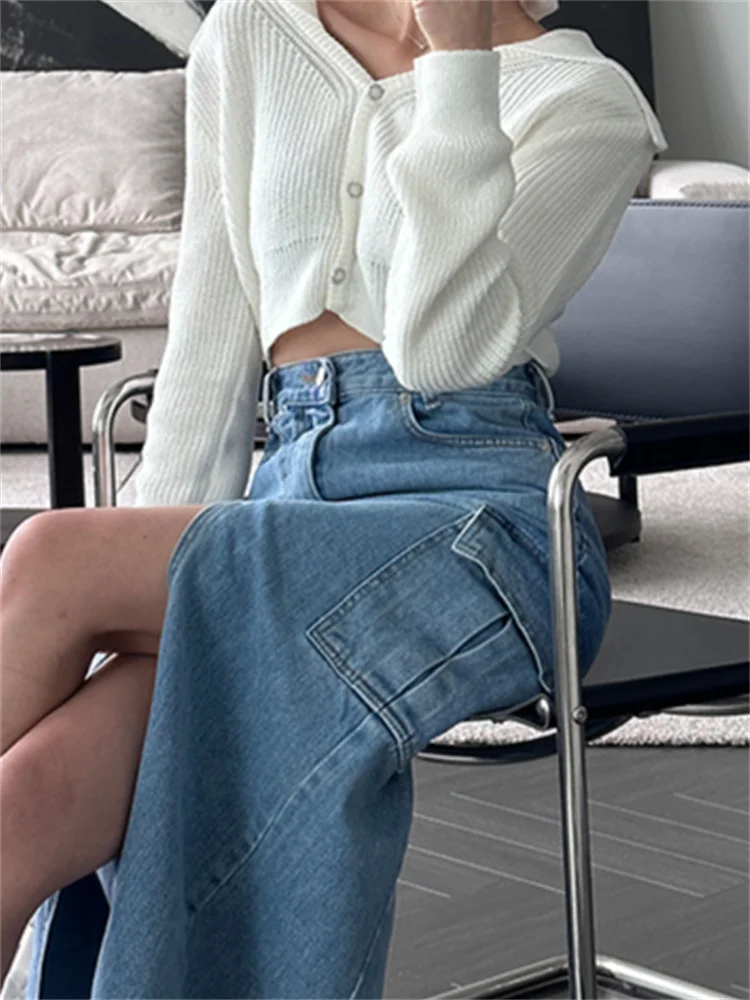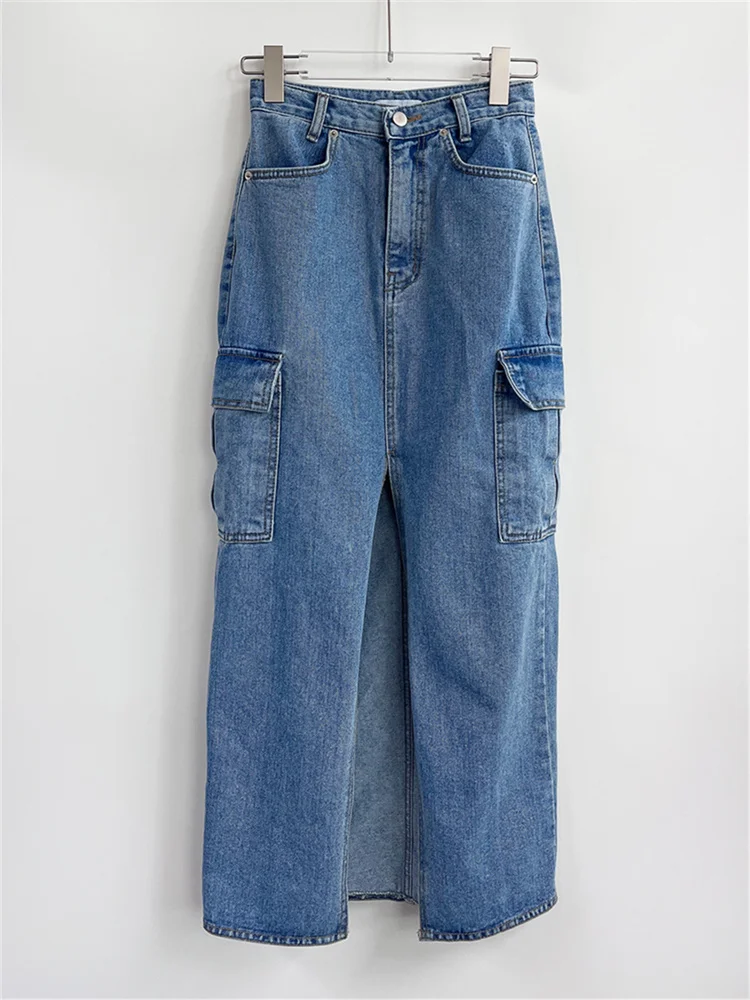 Cargo Jeans Skirt for Women High Waisted Side Pockets Split Fashion Midi Skirt Vintage Casual Streetwear Y2k Skirts