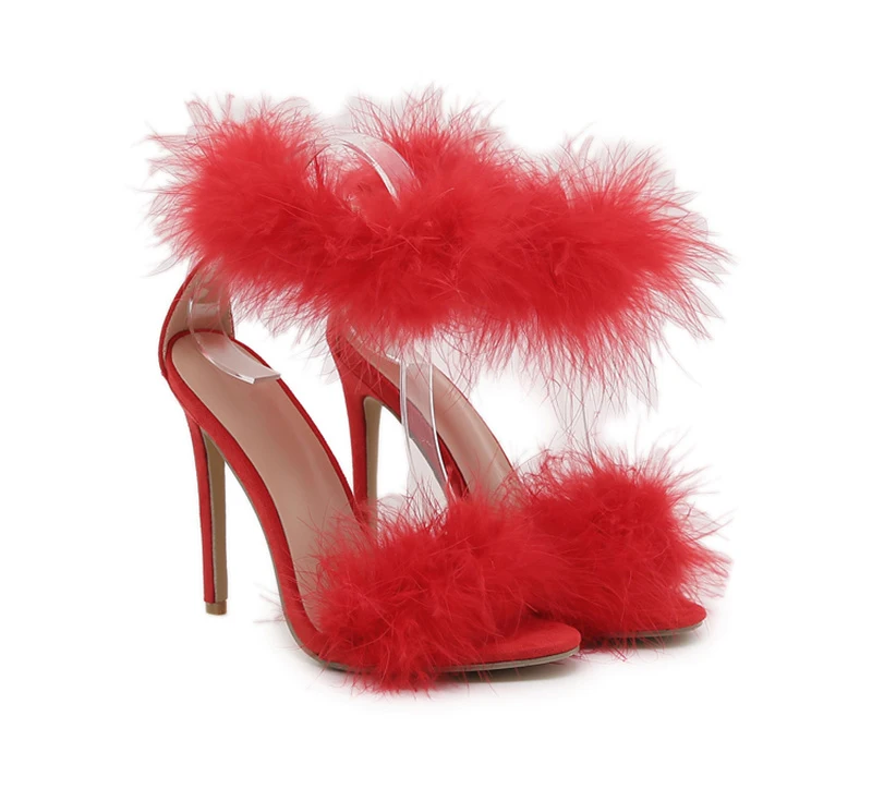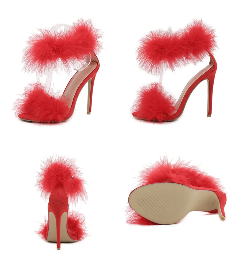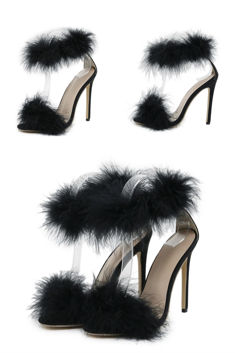 Summer Fashion Faux Fur Ankle Strap Sandals - Women's Open Toe Fluffy Feather High Heels - Party Dress Shoes Sandalias De Mujer