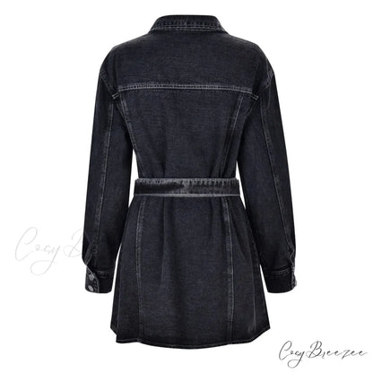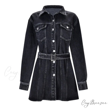 Fashionable Slim Mid-Cuff Belted Denim Office Spring Casual Long-Sleeve Women's Dress