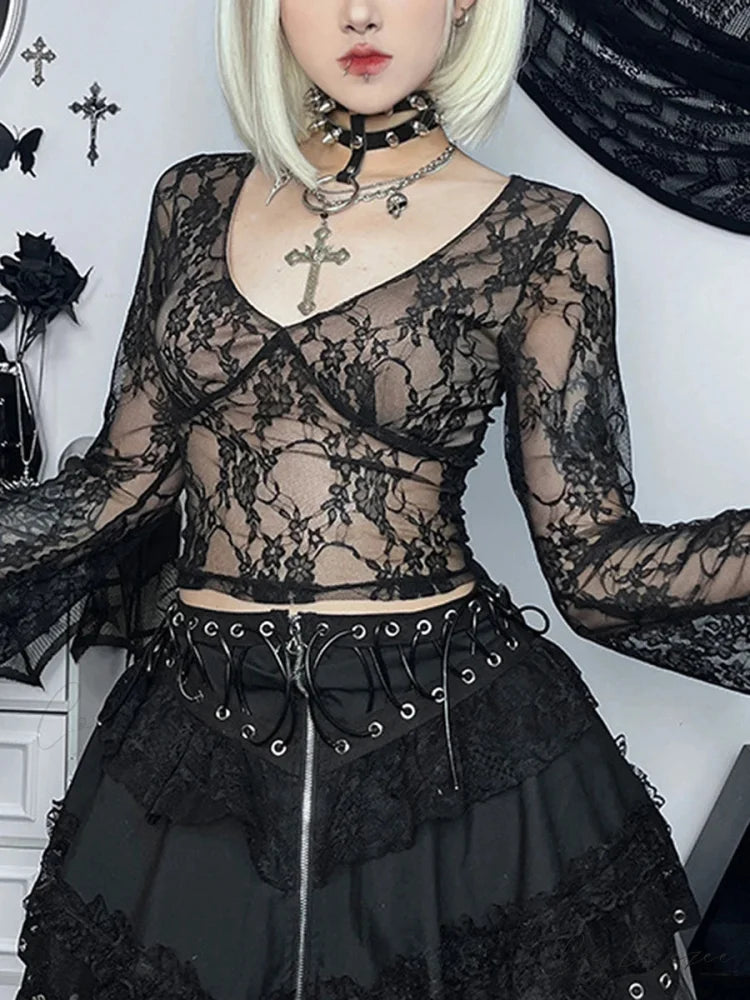 Lace Fairy Grunge V-neck See-Through Slim Fit Stylish Elegant Trendy Classic Crop Top