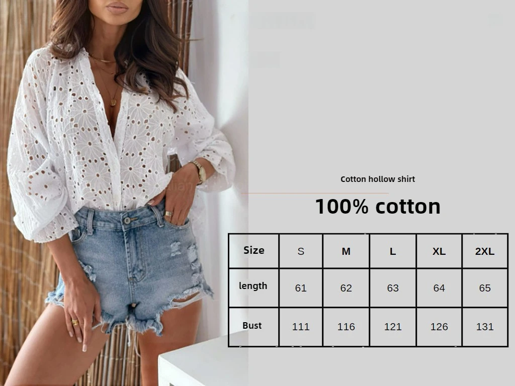 Cotton Floral Embroidery V-Neck Long Sleeve Blouse