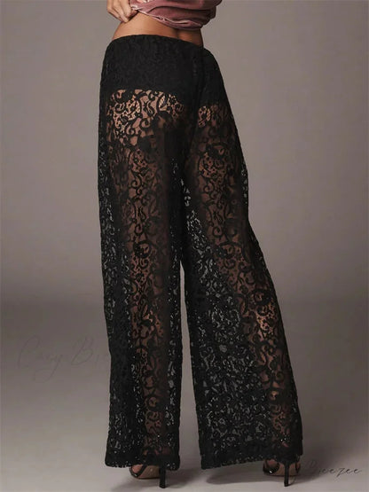 Lace Floral Net Transparent Black Wide Leg Pant